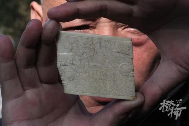 两人无比震撼:这是一件大玉琮,外方内圆,神人兽面的“神徽”很“迷你”,比一枚邮票略大。