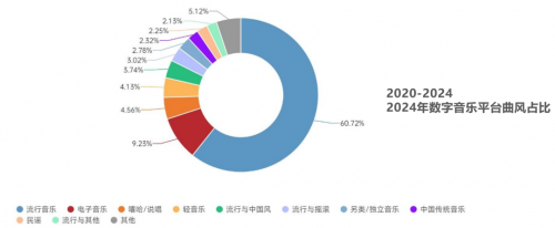 经协会测算,2024年在数字音乐平台流通的曲库中,流行音乐以60.72%的占比保持绝对主导地位。电子音乐位列其后,占比达9.23%,嘻哈说唱和轻音乐占比分别为4.56%和4.13%。