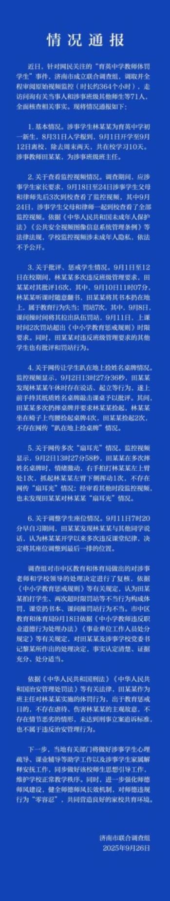 9月26日,济南市联合调查组发布“育英中学教师体罚学生”调查结果的情况通报。