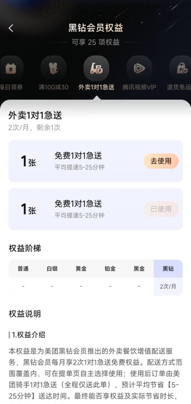 ▲黑钻会员每月可享2次免费“1对1急送”权益。图源:美团App