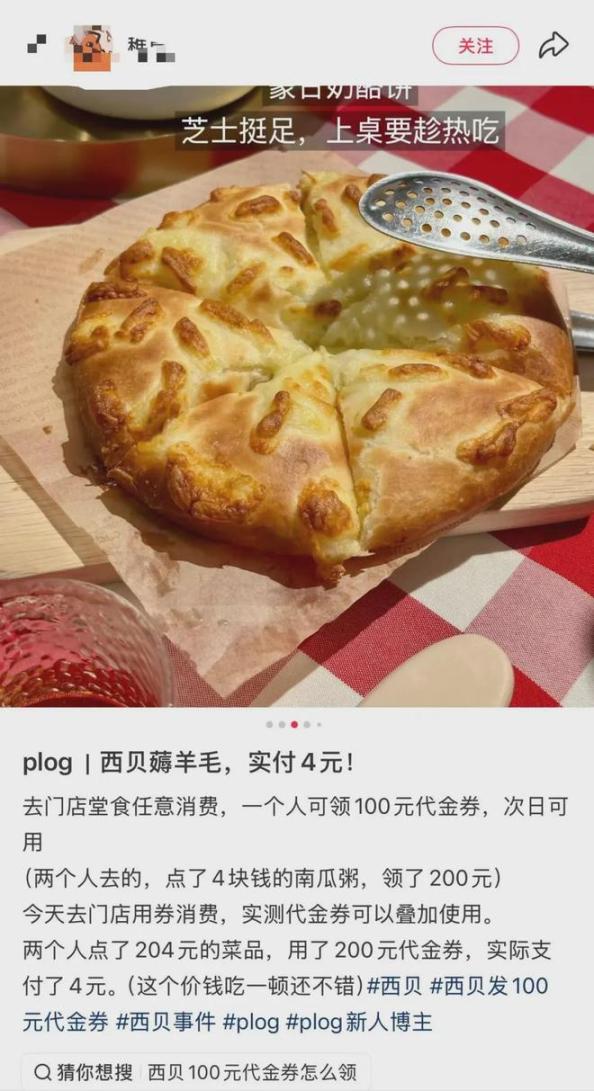 一位网友发文称,“西贝现在到店任意消费就送100元无门槛可累加代金券。我们四个人到店买了个大花卷、肉夹馍*2、枣糕,然后四个人用四个微信扫码领取了4张100块。第二天到店消费了417元,抵用消费券实际支付17元。”还有一位网友表示,之前两个人在西贝门店点了4块钱的南瓜粥,领了200元代金券。“今天去门店消费,两个人点了204元的菜品,实际支付了4元。”