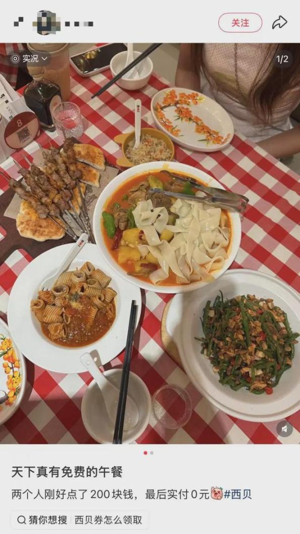 社交媒体上,不少网友晒出自己用代金券后的价格。红星新闻记者注意到,一位网友表示,“两个人刚好点了200块钱,最后实付0元。”