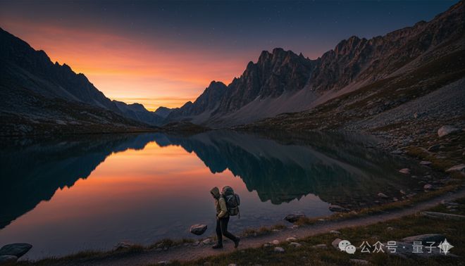 Prompt:一张关于风光大片的照片 内容为一位背包客埋头赶路 穿行在夕阳下的群山与湖泊之间 场景位于广阔的山峦与平静湖面前 背景是橙色霞光逐渐褪入深蓝夜空 湖面倒映着天空的色彩 氛围壮丽沉浸充满电影感 在日落时分的自然柔光下拍摄 使用 Nikon Z7 II 相机 16mm f/2.8 广角镜头 色彩风格为高细节高分辨率的电影级调色 画面比例为16:9