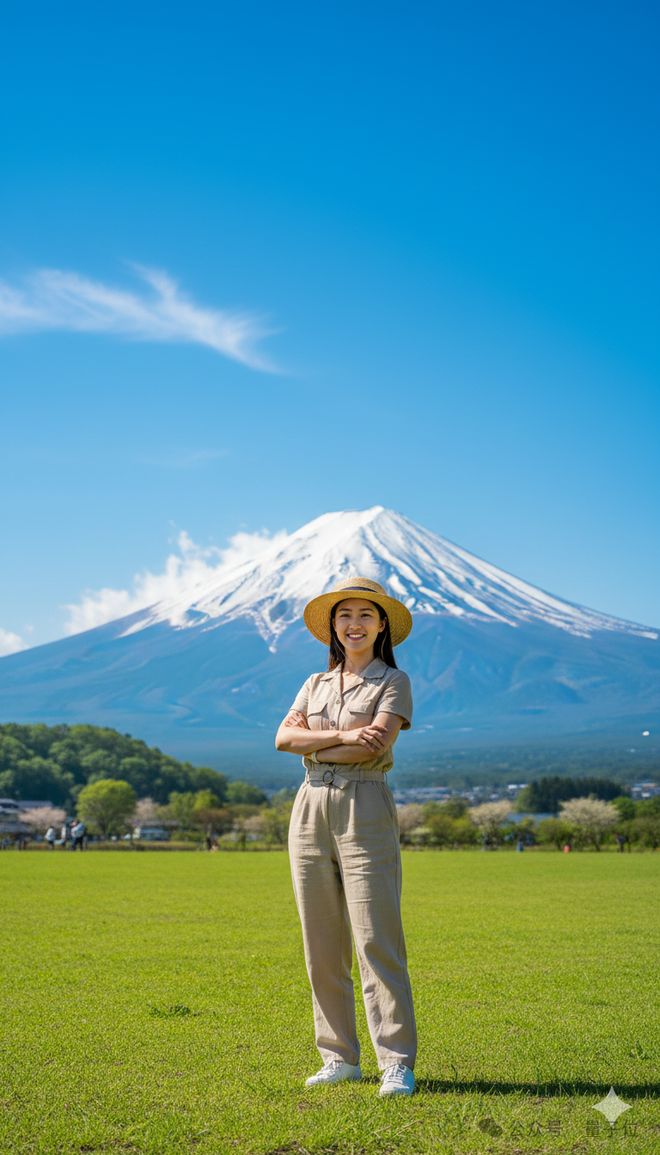 Prompt:一张人像照片,内容为一名中国女生在富士山下摆姿势拍摄。人物占据画面主要比例,背景是巍峨的富士山与蓝天白雪,充满整个画面。场景突出了人物与山峰之间的对比,营造出清晰震撼的氛围,带有旅行大片的质感。在自然白天阳光下拍摄,使用Sony Alpha 7R IV相机搭配85mm f/1.4镜头。色彩风格为高饱和度、明亮清晰的社交媒体风格。画面比例为9:16。