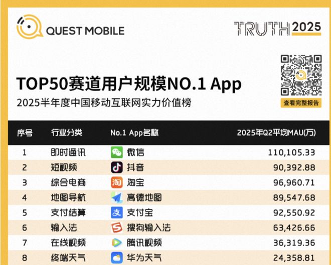 来源:QuestMobile发布的2025半年度中国移动互联网实力价值榜