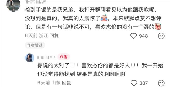 有网友在评论区说:“捡到手镯的是我兄弟,我打开群聊看见以为他跟我吹呢,没想到是真的,我真的太震惊了,本来默默点赞不想评论,但是有一句话非说不可,喜欢杰伦的没有一个孬的。”