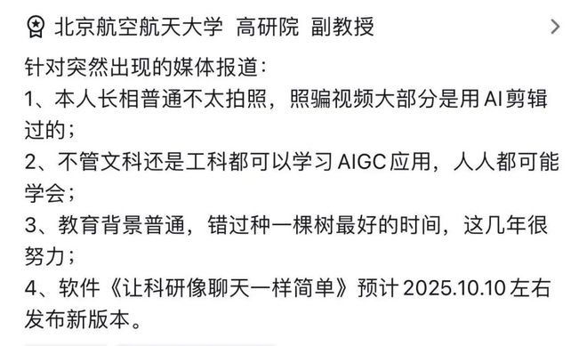 近日,北京航空航天大学一名90后女副教授,在短视频平台讲述生成式人工智能的授课视频引发关注。10月1日,北京航空航天大学高等研究院工作人员回应称