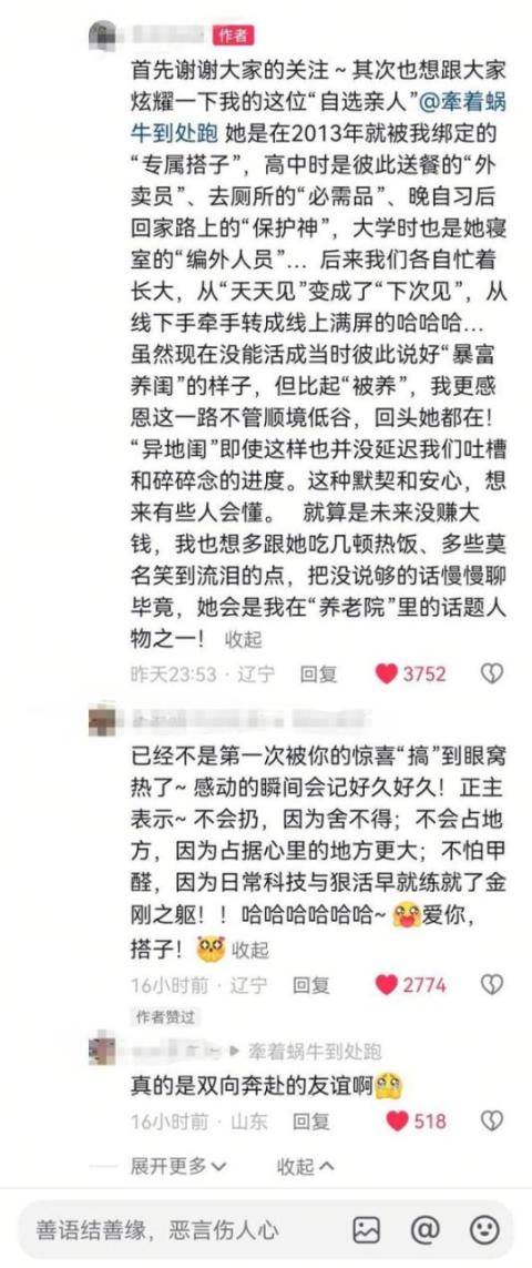 该视频引发网友的情感共鸣,大家纷纷点赞:“双向奔赴的美妙友谊”“时代姐妹花,此刻具象化”“希望你们的友谊长存,祝贺祝贺!”也有网友表示羡慕:“希望你们亲手做的礼物有个完美的结局,太棒啦”“羡慕你们的友情,加油!”