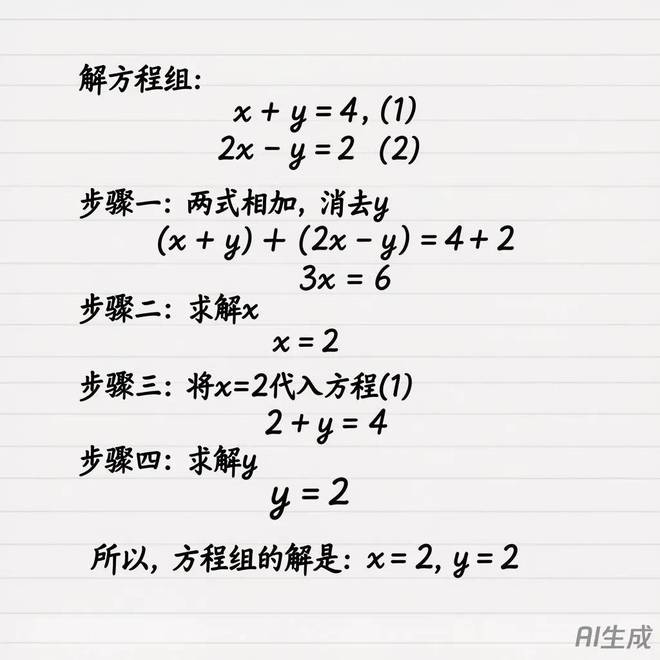 提示语:解方程组 x+y=4 ,2x-y=2,给出详细求解过程。
