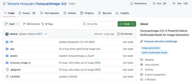 在 GitHub 上,混元图像 3.0 的 star 数已经突破了 1.7k,社区热度不断攀升,吸引了越来越多开发者的关注与参与。