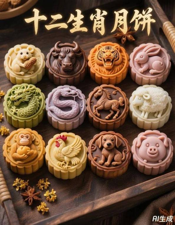 最后再来一个《十二生肖月饼》,祝大家中秋节快乐。「以中秋为题,融合传统文化与节日意象,月饼不同材质,比如抹茶、玫瑰,颜色各异。十二生肖各展风姿:鼠小巧玲珑、牛稳稳健、虎咆哮、兔可爱,龙飞腾、蛇轻灵,马驰骋千里,羊温顺,猴机灵古怪,鸡鸣瑞气,狗忠相伴情意长,猪憨可爱庆团圆。」