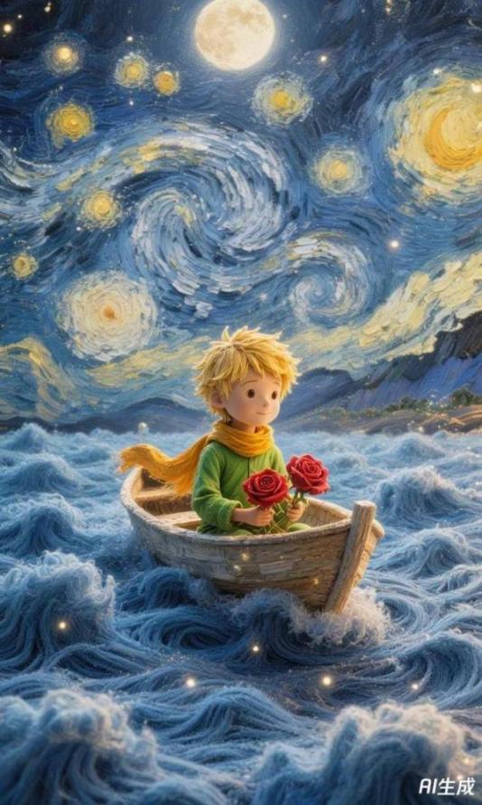 再来一个提示语「画面中心是一个金发小男孩,穿着绿色衣服,系着黄色围巾,坐在一条小船里,怀抱着两朵红玫瑰。小船漂浮在波浪般的蓝色海面上,海浪像是绒毛或艺术质感般细腻。背景是一片星空,带有梵高《星空》的旋转星云与明亮月亮。画面中点缀着闪烁的光点,营造温暖、浪漫和童话般的氛围。」