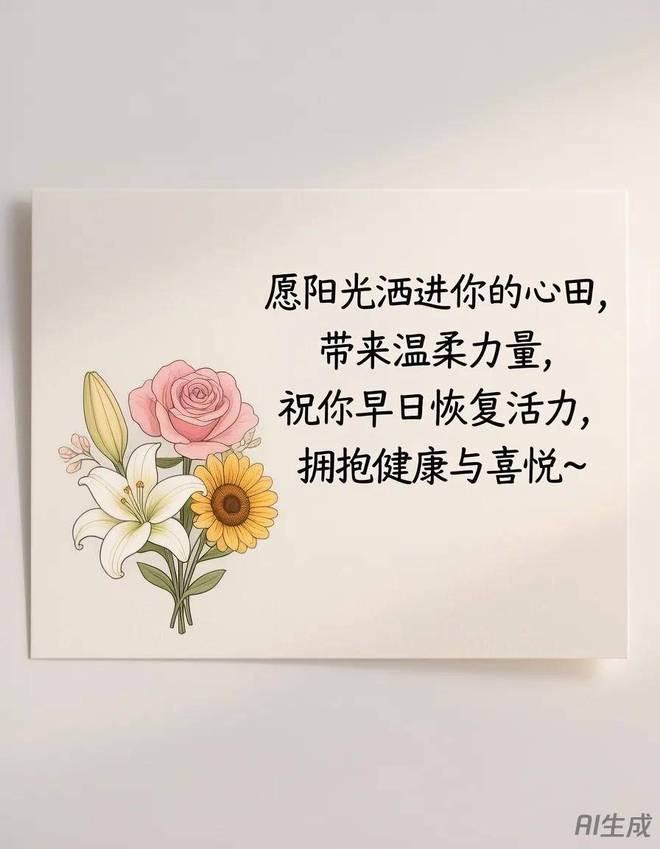 提示词:一张印有 “愿阳光洒进你的心田,带来温柔力量,祝你早日恢复活力,拥抱健康与喜悦~” 文字的祝福贺卡。卡片设计风格,特写构图,温暖柔和的氛围,简洁而精致。背景大面积留白,营造宁静感。文字旁边点缀一束鲜花,由玫瑰、百合、向日葵组合,色彩清新,传递关怀与希望。