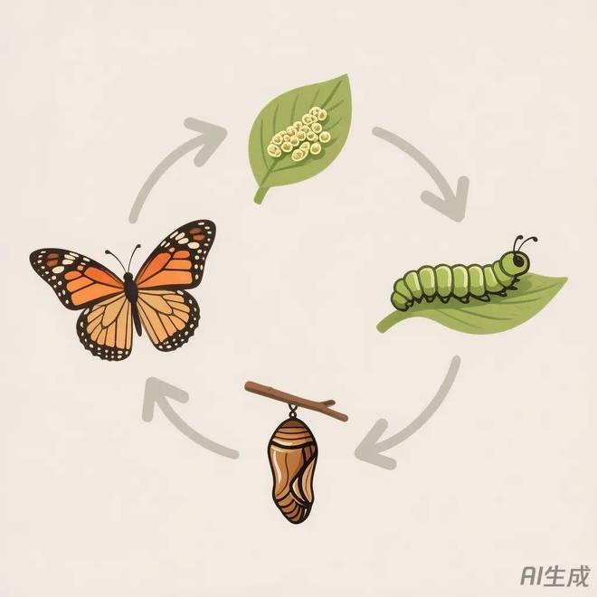 而当我们进一步输入提示「用循环箭头的形式解释破茧成蝶」,混元图像 3.0 又能切换到创意表达模式:它将自然的蜕变过程拆解成多个阶段。