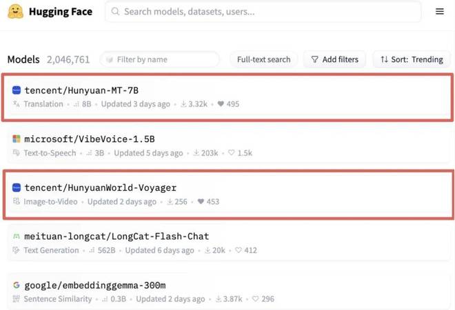 当然,腾讯也在积极布局开源。上月初开源的混元翻译模型 Hunyuan-MT-7B 以及最新的世界模型 HunyuanWorld-Voyager 一度在 Hugging Face 模型趋势榜单前三中占据两席。