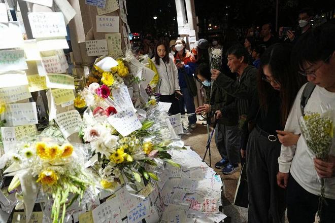 11月30日,香港市民自发在宏福苑火灾现场献花并留下“香港加油”等暖心纸条,表达了对遇难者的哀悼和对香港的祝福。 图:IC