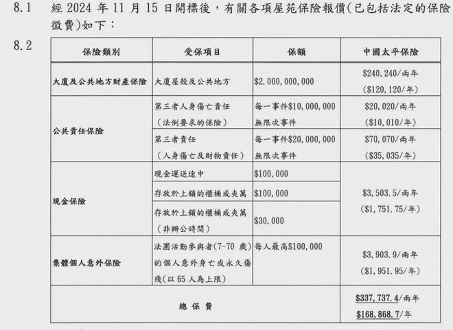 受灾居民关心的另一个问题是个人财物损失赔偿。宏福苑业主立案法团第十二届管理委员会第8次全体委员会议记录显示,屋苑继续向“中国太平保险(香港)有限公司”投保,大厦及公共地方财产保险保额20亿港元。公众责任保险的受保项目包括第三者人身伤亡责任(法例要求的保险)、第三者责任(人身伤亡及财务责任)。前者保额为每一事件1000万港元;后者保额为每一事件2000万港元。
