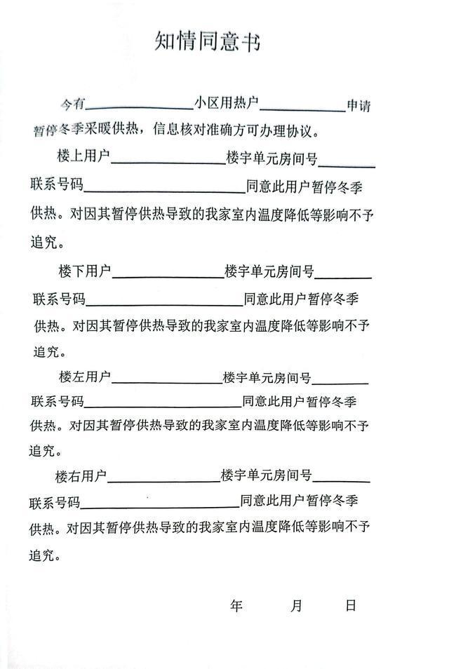 李磊向华商报大风新闻记者出示了这份需要左邻右舍签字的《知情同意书》,上面明确要求楼上、楼下、楼左、楼右四户签字,同意该用户暂停冬季供热,并对因其暂停供热导致的自家室内温度降低等影响不予追究。