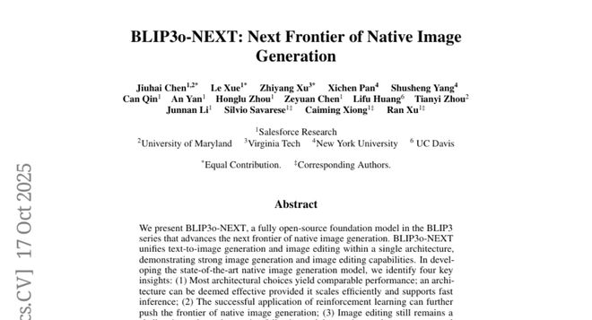 这项由马里兰大学的陈九海、维吉尼亚理工大学的薛乐、纽约大学的潘希晨等多位研究者共同完成的研究,发表于2025年10月17日的arXiv预印本平台(论文编号:arXiv:2510.15857v1),有兴趣深入了解的读者可以通过这个编号查询完整论文。研究团队开发出了一个名为BLIP3o-NEXT的全新图像生成模型,这个模型就像是一位既懂艺术又懂技术的超级画师,不仅能根据文字描述创作全新的图像,还能对现有图片进行精确的编辑修改。