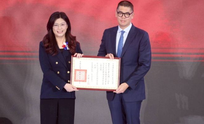 国民党主席选监小组召集人连胜文(右)1日将当选证书交给新任党主席郑丽文(左)。图源:台媒