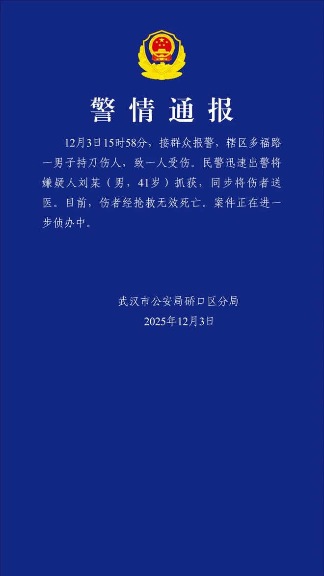 武汉市公安局硚口区分局通报:12月3日15时58分,接群众报警,辖区多福路一男子持刀伤人,致一人受伤。民警迅速出警将嫌疑人刘某(男,41岁)抓获,同步将伤者送医。目前,伤者经抢救无效死亡。案件正在进一步侦办中。