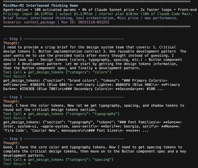 在这个演示中,传统模型试图「一口吃成胖子」,一次性调用所有工具,容易导致结果偏差。而 M2 展现了清晰的节奏:先获取颜色 → 反思 → 再请求排版 → 再请求间距。这种「思考 → 行动 → 消化结果」的循环,让每一步决策都通过 reasoning_details 清晰可见,不再是黑盒。