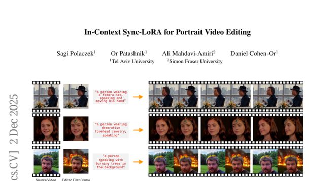 说到底,我们每天都在刷各种视频,看到那些明星换装、美颜特效的视频时,你有没有想过这些都是怎么做出来的?最近,来自以色列Tel Aviv大学和加拿大Simon Fraser大学的研究团队,就在这个领域取得了重大突破。他们开发出了一种名为Sync-LoRA的新技术,专门用来编辑人像视频。这项研究由Tel Aviv大学的Sagi Polaczek、Or Patashnik、Daniel Cohen-Or,以及Simon Fraser大学的Ali Mahdavi-Amiri共同完成,发表于2025年12月。对这个技术感兴趣的朋友可以通过arXiv编号2512.03013查询完整论文。