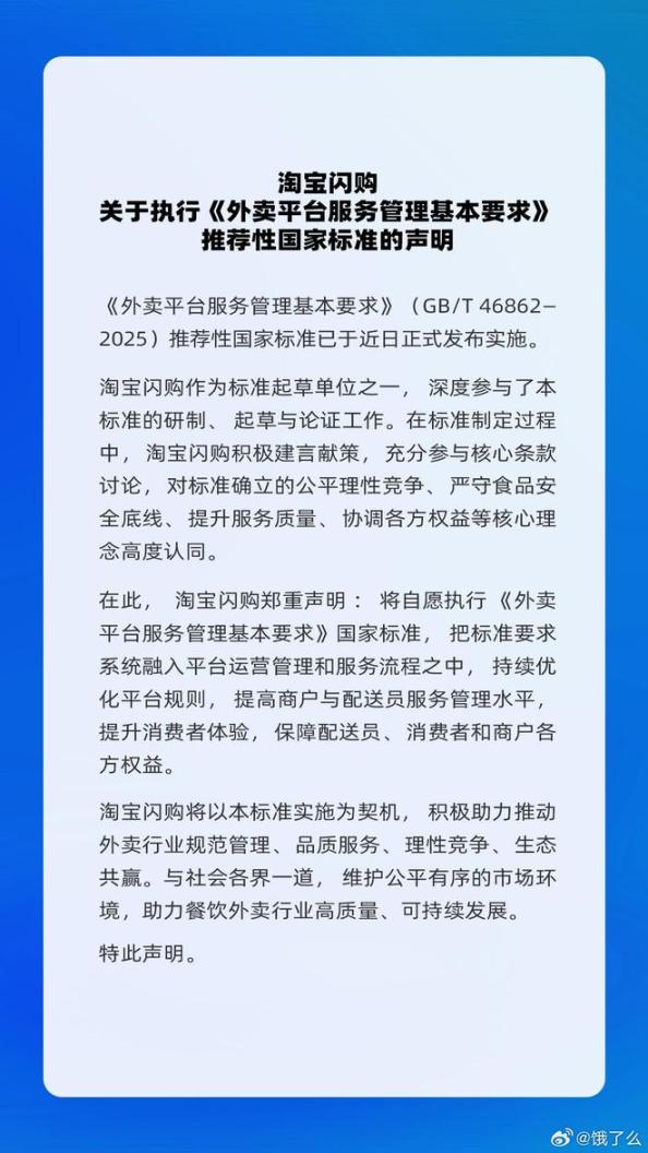 12月4日,淘宝闪购发布关于执行《外卖平台服务管理基本要求》推荐性国家标准的声明:将自愿执行《外卖平台服务管理基本要求》国家标准,把标准要求系统融入平台运营管理和服务流程之中,持续优化平台规则,提高商户与配送员服务管理水平,提升消费者体验,保障配送员、消费者和商户各方权益。