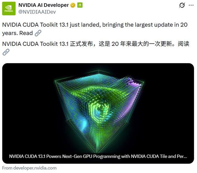 几个小时前,NVIDIA CUDA Toolkit 13.1 正式发布,英伟达官方表示:「这是 20 年来最大的一次更新。」