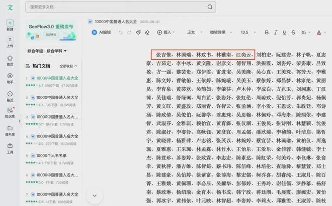 “张吉惟、林国瑞、林玟书、林雅南、江奕云”……这5个名字因出现在中国政府采购网12月3日公布的《竹溪县住房和城乡建设局本级机械设备租赁采购中标(成交)结果公告》第五项评审小组成员名单中,而被舆论熟知。但事实上,这5个名字均出自某平台文库《10000中国普通人名大全》(下称《人名大全》)文档,且位列前5位。