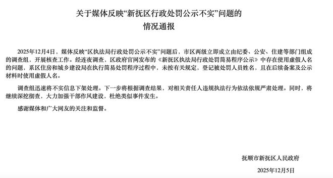 12月5日下午,抚顺市新抚区政府就“新抚区行政处罚公示不实”问题发布情况通报称:经连夜调查,区政府官网发布的《公示》中存在使用虚假人名的问题,系区住房和城乡建设局在执行简易处罚程序过程中,未按有关规定登记被处罚人员姓名,且在后续备案及公示材料时使用虚假人名。下一步将根据调查结果,对相关责任人违规执法行为依法依规严肃处理。