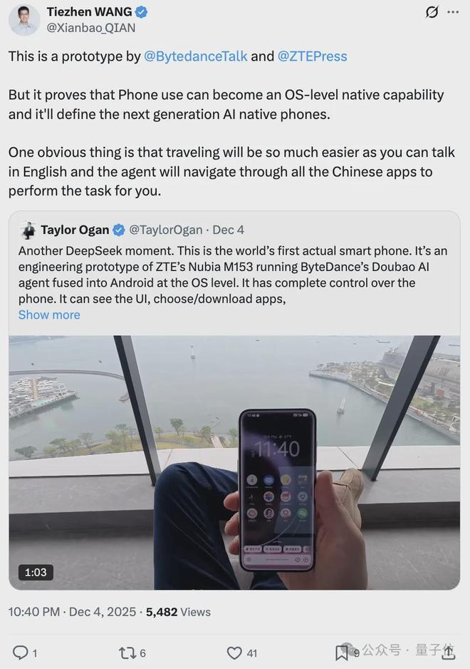 在华创业者Taylor Ogan拿到了手机后,就在上连发帖子,给出的评价那是相当的高(发出宋丹丹的声音),称其为“又一次DeepSeek时刻,这是全球第一部真正的AI智能手机”。