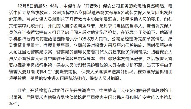 10日凌晨,南非中国经贸协会发文《同胞凌晨紧急电话救助 保安公司快速反应确保安全》,全文如下: