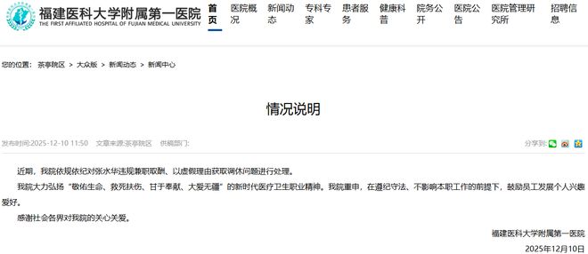 12月10日,福建医科大学附属第一医院发布情况说明称,依规依纪对“最快女护士”张水华违规兼职取酬、以虚假理由获取调休问题进行处理。