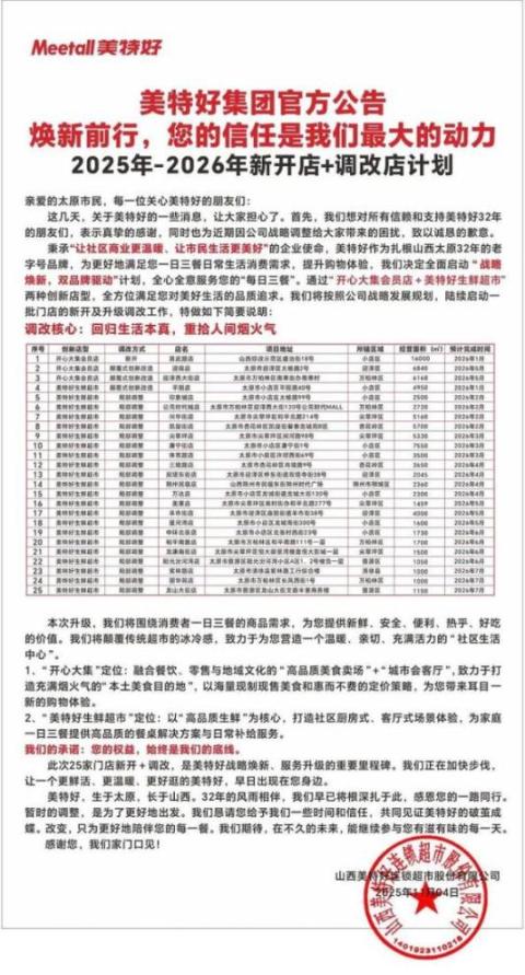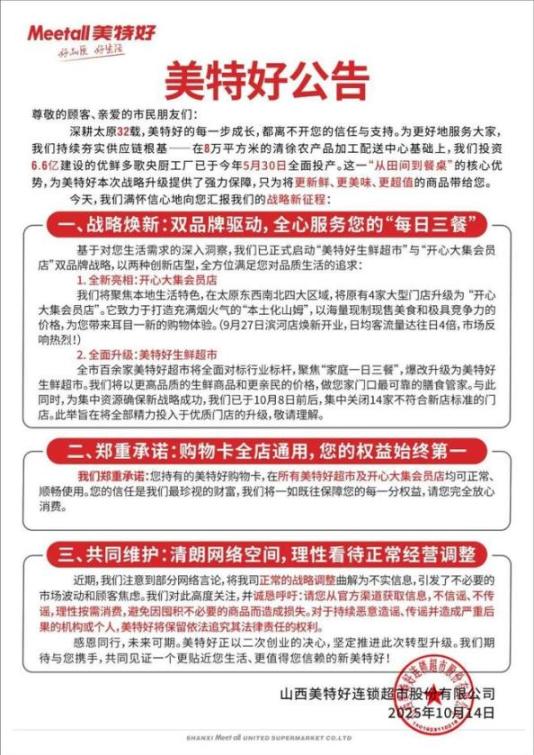 11月4日,美特好发布2025年-2026年新开店+调改店计划官方公告:首先,我们想对所有信赖和支持美特好32年的朋友们,表示真挚的感谢,同时也为近期因公司战略调整给大家带来的困扰,致以诚恳的歉意。此次25家门店新开+调改,是美特好战略焕新、服务升级的重要里程碑。暂时的调整,是为了更好地出发。我们期待,在不久的未来,能继续参与您有滋有味的每一天。10月14日,美特好超市发布公告称,消费者持有的美特好购物卡,在所有美特好超市及开心大集会员店均可正常、顺畅使用。并且呼吁顾客按需消费,避免因囤积不必要的商品而造成损失。
