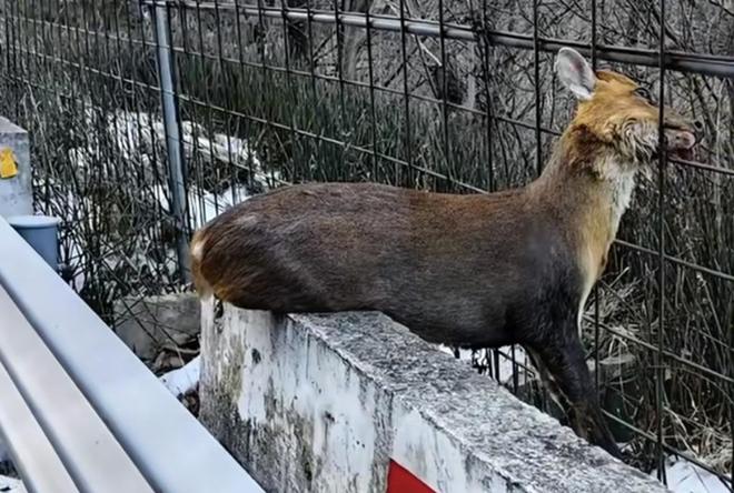 12月10日,一只野生麂子被卡在210国道秦岭段路边围网上,后被解救放生