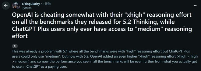 一位用户通过精细计算发现了「华点」:OpenAI在最新发布的基准测试中,可能通过调整模型「推理力度」参数,让GPT-5.2在关键评测中使用了远超对手的算力资源。