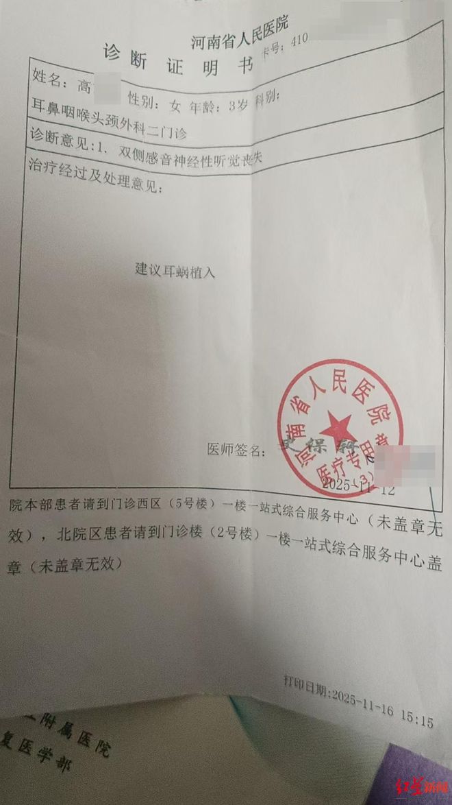 另一份来自河南省人民医院的诊断证明书则显示,今年11月,小高被诊断为“双侧感音神经性听觉丧失”,处理意见为“建议耳蜗植入”。