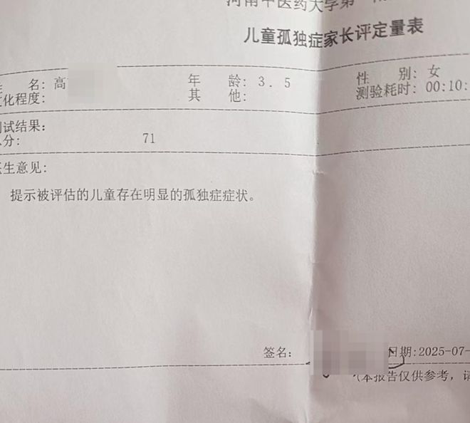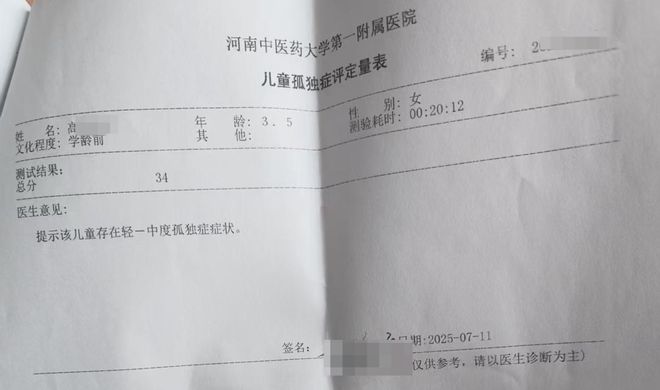 段女士向红星新闻记者提供的两份医院报告显示,其女小高于今年7月在河南中医药大学第一附属医院做了两次儿童孤独症评定测验。段女士介绍,在一次耗时20余分钟的测验后,医生意见显示为“提示该儿童存在轻—中度孤独症症状”;而在另一次耗时10余分钟的测验后,医生意见显示为“存在明显的孤独症症状”。