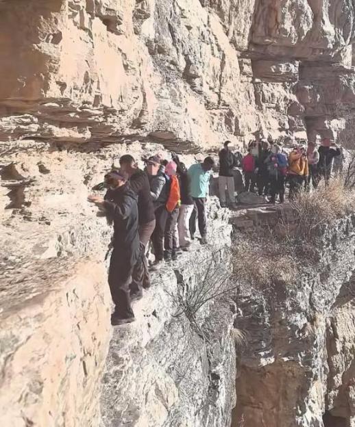 网友发布的视频里,五六名驴友正侧身艰难通过一段悬崖峭壁,峭壁看起来至少有数十米深,驴友们在半山腰双手扒着山体,靠手牵引带动脚步一点一点挪动,而这段峭壁的可视宽度只有成年人一只鞋的长度,移动过程中,山体有凸起,驴友们只能双手紧紧扒住山体防止掉落。整个攀爬过程没有任何防护措施,几秒钟后,有一名女驴友单手扶着山体,另一手冲着镜头挥动。该网友发布视频留言称“南北梯,挑战壁虎崖”。而在壁虎崖的另一侧还有数十名驴友等待通过。视频发出后,评论区不少网友表示“万一掉下去怎么办?”“爱爬山,但这种永远不要去尝试,这就是玩命!”