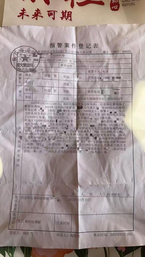 刘某向公安机关反映,2024年12月24日,曹先生因进货资金不足,向他借款5万元,承诺过完年后偿还并支付5000元报酬,刘某现场转账5万元给曹先生。2025年2月1日,刘某讨要5万元借款和5000元报酬,因曹先生微信限额,现场只支付了5000元,并承诺过两天再支付剩余借款。2月3日,刘某再次讨要借款时,曹先生表示没有借款。后刘某向沅江市法院起诉曹先生借钱不还。