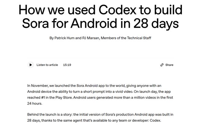 近日,OpenAI发布了一篇名为《如何在28天内用Codex构建Android版Sora》的播客,讲述了一个四人工程师团队与OpenAI的编程智能体Codex,从今年的10月8日到11月5日,花费28天时间,消耗约50亿个Token,将安卓版Sora从原型阶段推向全球发布,其中85%的代码由Codex编写。