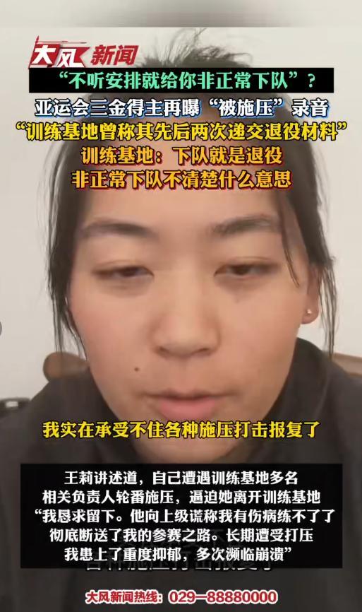 王莉讲述道,自己遭遇训练基地多名相关负责人轮番施压,逼迫她离开训练基地,“我恳求留下。他向上级谎称我有伤病练不了了,彻底断送了我的参赛之路。长期遭受打压,我患上了重度抑郁,多次濒临崩溃。”