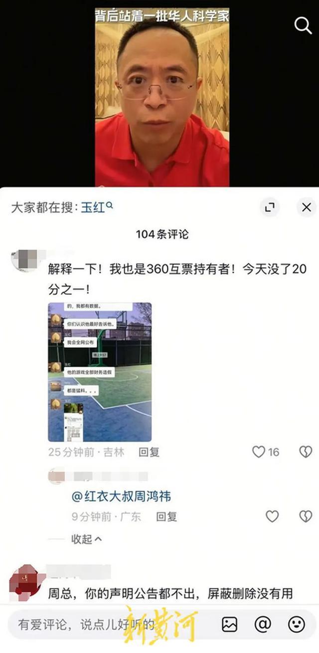 这条视频的评论区出现大量投资者留言。多名用户贴出了玉红的爆料截图,要求周鸿祎“解释一下”。还有人自称持有360股票,“今天大跌”。
