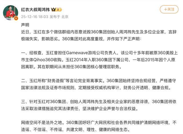 12月16日,360集团发布关于玉红恶意诋毁360集团创始人周鸿祎先生的严正声明: