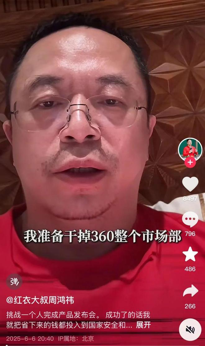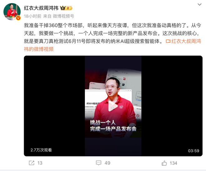 周鸿祎表示,“从今天起我要准备做一个挑战,我一个人要完成一场完整的新产品发布会——测试公司6月11号即将发布的纳米AI超级搜索智能体。”“这件事我如果干成了,就意味着AI智能体确实有颠覆性的发展,传统的效率模型可能要被淘汰了,360市场部也可以全部转岗到其它部门或者都给我编智能体去。”周鸿祎表示。