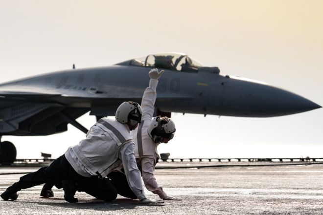 6月30日,山东舰舰载战斗机滑跃起飞 图:新华社