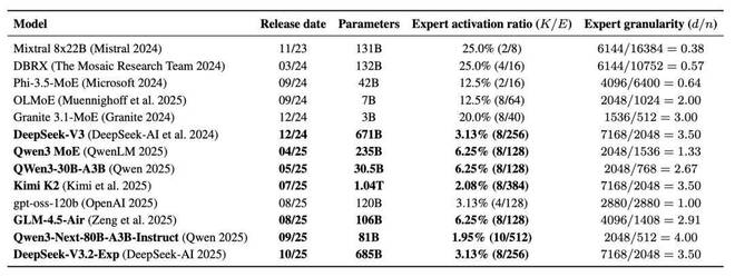 表 1:MoE 扩展趋势:在此,团队将激活率展示为每个 Token 激活的专家数 K / 专家总数 E;针对前沿开源模型,专家粒度展示为模型嵌入维度(d)/ 专家中间层大小(n)。在 MoE 稀疏度计算中未包含共享专家。趋势表明,新的开源 MoE 模型倾向于具备更高的粒度和稀疏度。