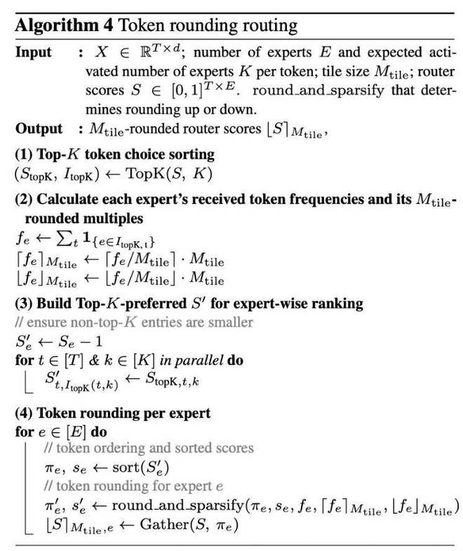 Token rounding 算法首先计算基础的 TC(token-choice)路由结果,并对每个 expert 对应的 token 按路由分数进行排序,之后在第二步排序中选择:要么丢弃第一步 TC top-K 选择中的部分 token,要么在第二步排序中为某些 expert 补齐额外的 token(填充)。
