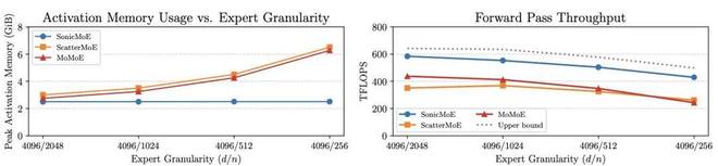 图 1: 即使专家粒度(d/n,其中 d 为嵌入维度,n 为专家中间维度)增加,SonicMoE 的每层激活显存占用(左图)仍保持恒定;相比其他基线,其显存效率提升了 0.20 倍至 1.59 倍。SonicMoE 的前向计算吞吐量(右图)平均达到了理论上限的 88%(最高 91%,最低 86%),该上限基于 H100 GPU 上的 「cuBLAS BMM + 激活函数 + cuBLAS BMM + 聚合操作」 计算得出。请注意,cuBLAS 上限基线未包含路由计算部分。在此,我们使用的是 30B 参数量的 MoE 配置,微批次大小为 32768 个 token,并且从左至右依次将「激活专家数 / 总专家数」设置为 2/32、4/64、8/128 和 16/256。